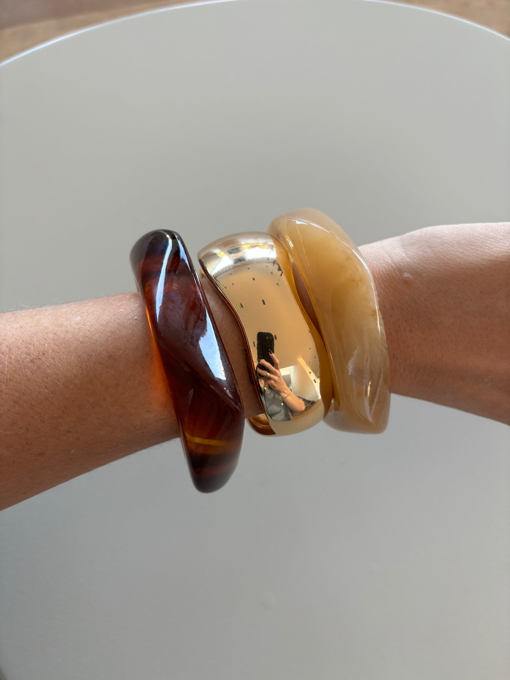 Ein stilvolles Trio für jeden Tag: Diese modernen Armreifen kombinieren zeitlose Eleganz mit einem lässigen Twist. Die fließenden, organischen Formen und warmen Farbtöne – von honigfarbenem Beige über glänzendes Gold bis hin zu tiefem Bernstein – machen sie zu perfekten Allroundern.
